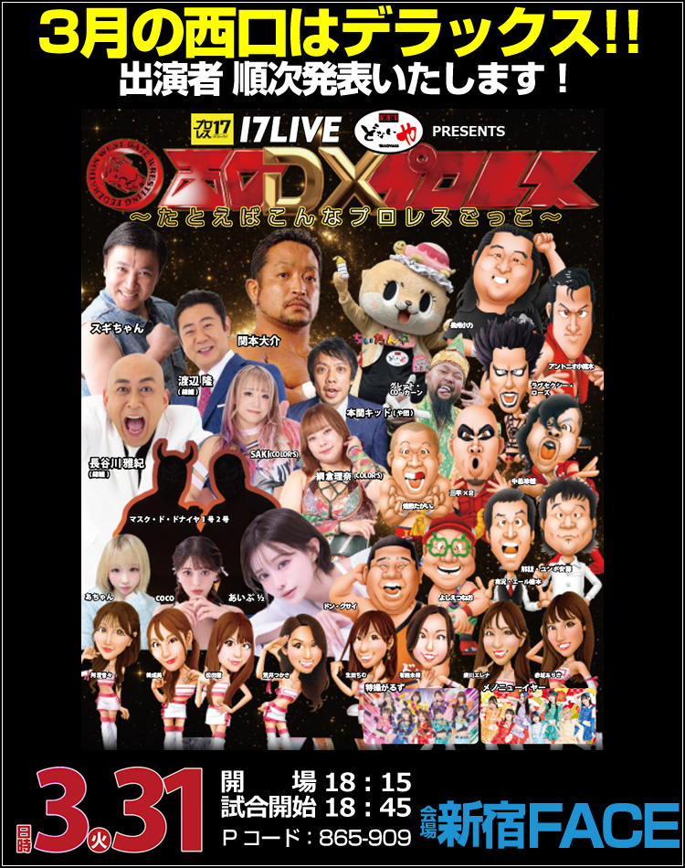 2026年02月10日 西口DXプロレス2026年3月大会〜たとえばこんなプロレスごっこ!〜 2026年01月07日 西口プロレス2026年2月大会〜西口プロレス創立25周年記念大会〜 2025年12月05日 西口プロレス2026年1月大会〜笑い取っても関節取るな〜 2025年11月20日 西口プロレス2025年12月大会〜西口最強タッグ決定リーグ戦2025〜 2025年10月28日 西口DXプロレス2025年11月大会〜宣告。遊びじゃないんだ!〜 2025年09月05日 西口プロレス2025年10月大会〜真剣勝負にゃちがいない〜 2025年08月04日 西口プロレス小橋太っ太 引退記念試合 〜グッバイ!遅れた青春の握り拳〜